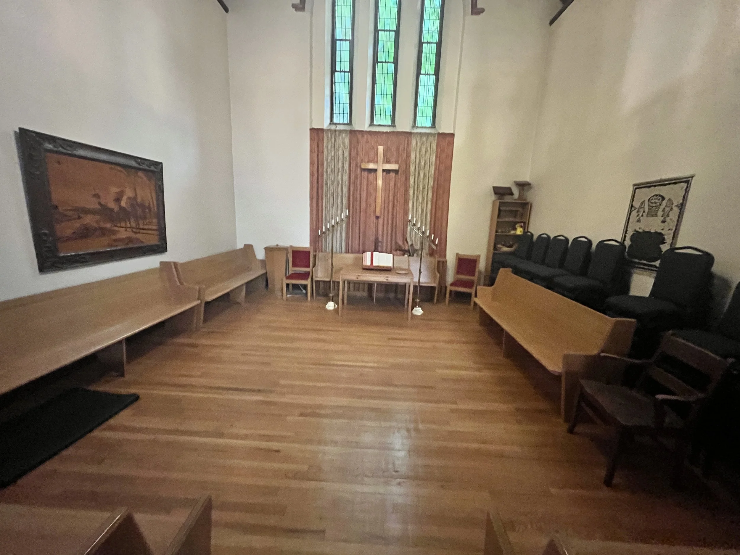 A sanctuary, with excellent acoustics, a centre-aisle, and seating for 250,